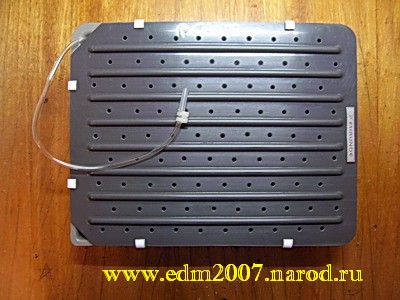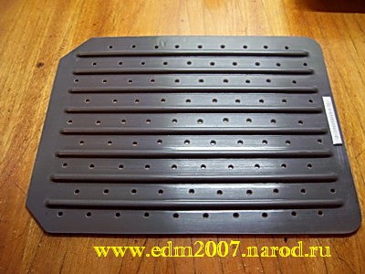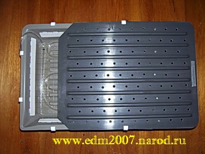 Крышка. Собственно на этом можно было бы и закончить, но при испытании данного агрегата с водой выяснилась одна не совсем приятная особенность. Дело в том, что работающий агрегат разбрызгивает в разные стороны очень мелкие капли. Возможно, для кого-то это не будет являться проблемой, но лично у меня возникло желание сделать крышку. По размерам кюветы, из пластмассы была вырезана заготовка, в которой были просверлены отверстия достаточные для вентиляции, но недостаточные для загрязнения окружающего пространства: