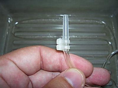 Естественно, с одной стороны трубка заранее глушится, с другой стороны закрепляется наконечник от той же капельницы, для более удобного подключения к источнику воздуха (о нем немного позднее):