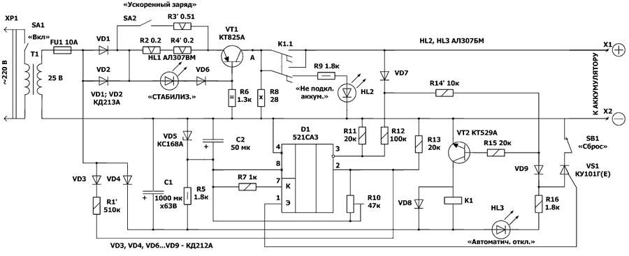Устройство позволяет не только заряжать, но и восстанавливать аккумуляторы с засульфатированными пластинами за счет использования ассиметричного тока при зарядке в режиме заряд (5 А) — разряд (0,5 А) за полный период сетевого напряжения. В устройстве предусмотрена также возможность при необходимости ускорить процесс заряда. В отличие от схем, приведенных на рис. 4.2 и 4.3, данное устройство имеет ряд дополнительных функций, способствующих удобству их использования. Так, при окончании заряда схема автоматически отключит аккумулятор от зарядного устройства. А при попытке подключить неисправный аккумулятор (с напряжением ниже 7 В) или же аккумулятор с неправильной полярностью схема не включится в режим заряда, что предохранит зарядное устройство и аккумулятор от повреждений. В случае короткого замыкания клемм Х1 (+) и Х2 (—) при работе устройства перегорит предохранитель FU1. Электрическая схема (рис. 4.4) состоит из стабилизатора тока на транзисторе VT1, контрольного устройства на компараторе D1, тиристора VS1 для фиксации состояния и ключевого транзистора VT2, управляющего работой реле К1.
