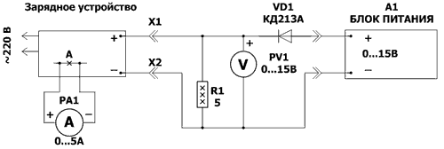 Рис. 4.5. Схема соединений для настройки зарядного устройства Настройку начинаем с подбора номинала резистора R14. Для этого от блока питания А1 подаем напряжение 7 В и изменением номинала резистора R14 добиваемся, чтобы реле К1 срабатывало при напряжении не менее 7 В. После этого увеличиваем напряжение с источника А1 до 14,7 В и настраиваем резистором R10 порог срабатывания компаратора (для возврата схемы в исходное состояние после включения тиристора надо нажать кнопку SB1). Может также потребоваться подбор резистора R1. В последнюю очередь настраиваем стабилизатор тока. Для этого в разрыв цепи коллектора VT1 в точке "А" временно устанавливаем стрелочный амперметр со шкалой 0...5 А. Подбором резистора R4 добиваемся показаний по амперметру 1,8 А (для амплитуды тока 5 А), а после этого при включенном SA2 настраиваем R4, значение 3,6 А (для амплитуды тока 10 А). Разница в показании стрелочного амперметра и фактической величины тока связана с тем, что амперметр усредняет измеряемую величину за период сетевого напряжения, а заряд производится только в течение половины периода. В заключение следует отметить, что окончательную настройку тока стабилизатора лучше проводить на реальном аккумуляторе в установившемся режиме — когда транзистор VT1 прогрелся и эффект роста тока за счет изменения температуры переходов в транзисторе не наблюдается. На этом настройку можно считать законченной. По мере заряда аккумулятора напряжение на нем будет
