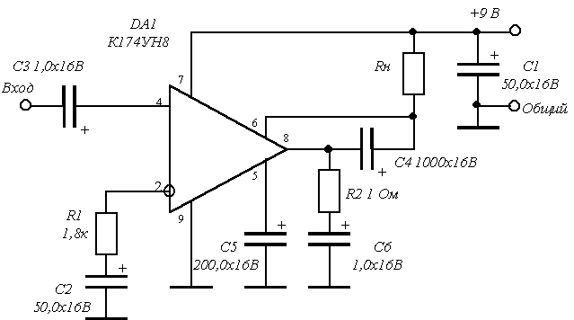 Схема включения ИМС К174УН8 с заземленной нагрузкой