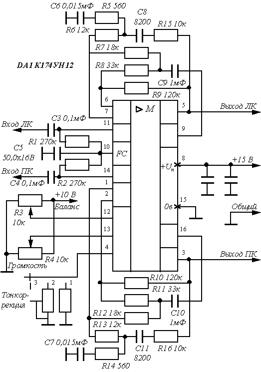 тонкоррекцией при Uп = 15 В, Uвх = 100 мВ, f = 1 кГц