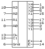 ![]() Назначение выводов: X1-X4- аналоговые входы (выходы). Y1-Y4- аналоговый выходы (входы). A0-A3- управляющий код. Ck- тактовый вход. Cl- сброс регистра. E+ положительное напряжение питания (+15 в). E- отрицательное напряжение питания (-15 в). Gnd- общий вывод (цифровая земля). Таблица функционирования