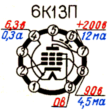 При Uн = 6,3 В, Uа = 200 В, Uс2 = 90 В, (Uс1 = - 2 В для EF183), Rк = 120 Ом.
