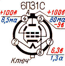 При Uн=6,3 В, Ua=100 В, Uс2=100 В, Uс1= -9 В.