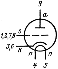 а - анод, с - сетка, к - катод, п - подогреватель катода.