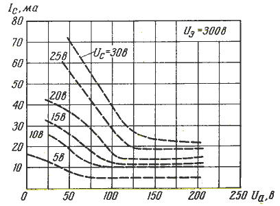| Ток в цепи анода при смещении на первой сетке минус 20 В,