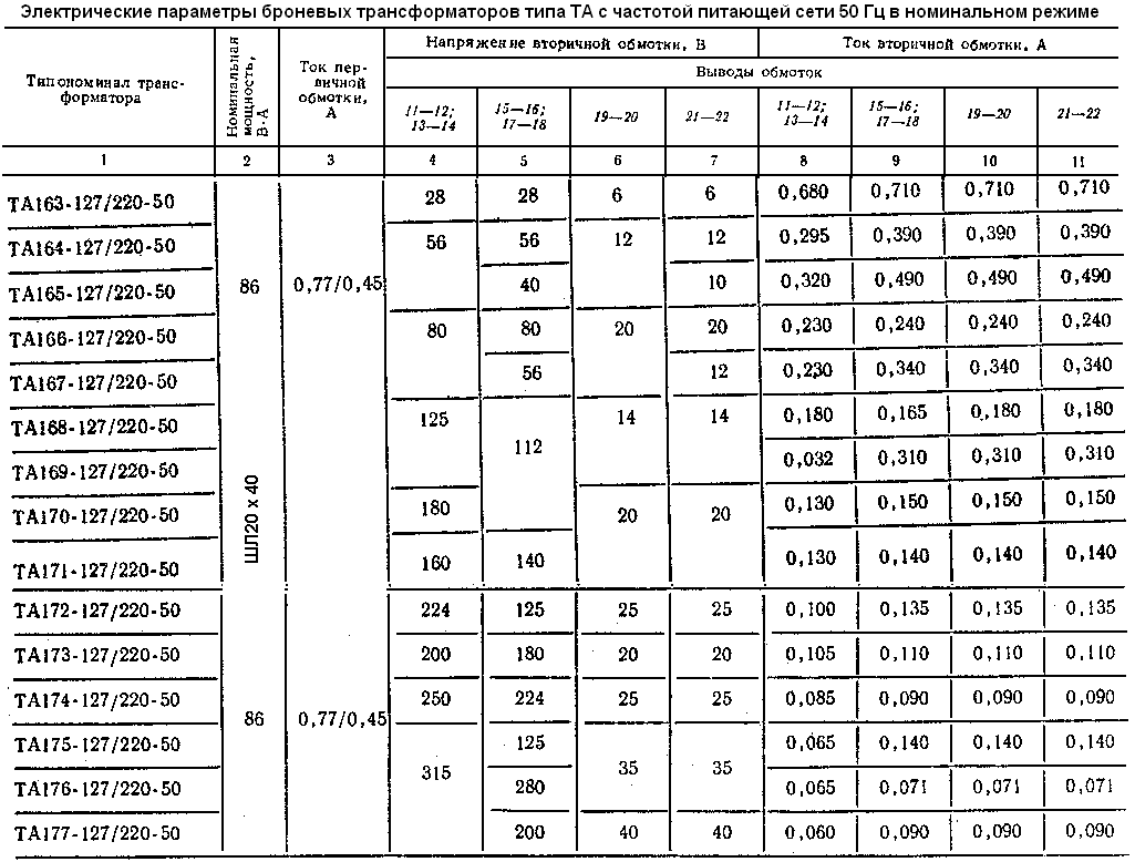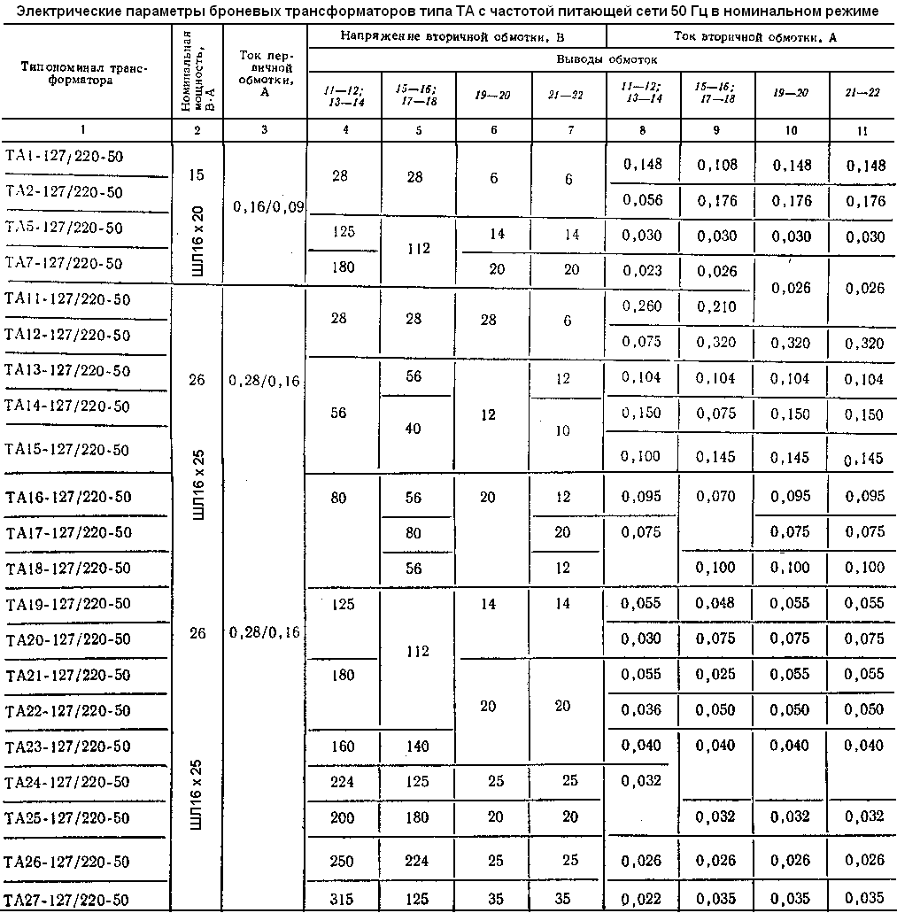 Справочные данные броневых трансформаторов ТА1 - ТА27