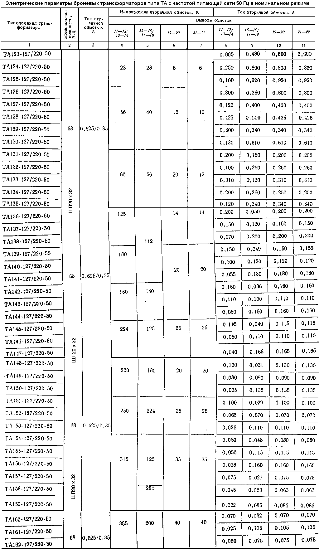 Справочные данные броневых трансформаторов ТА123 - ТА162