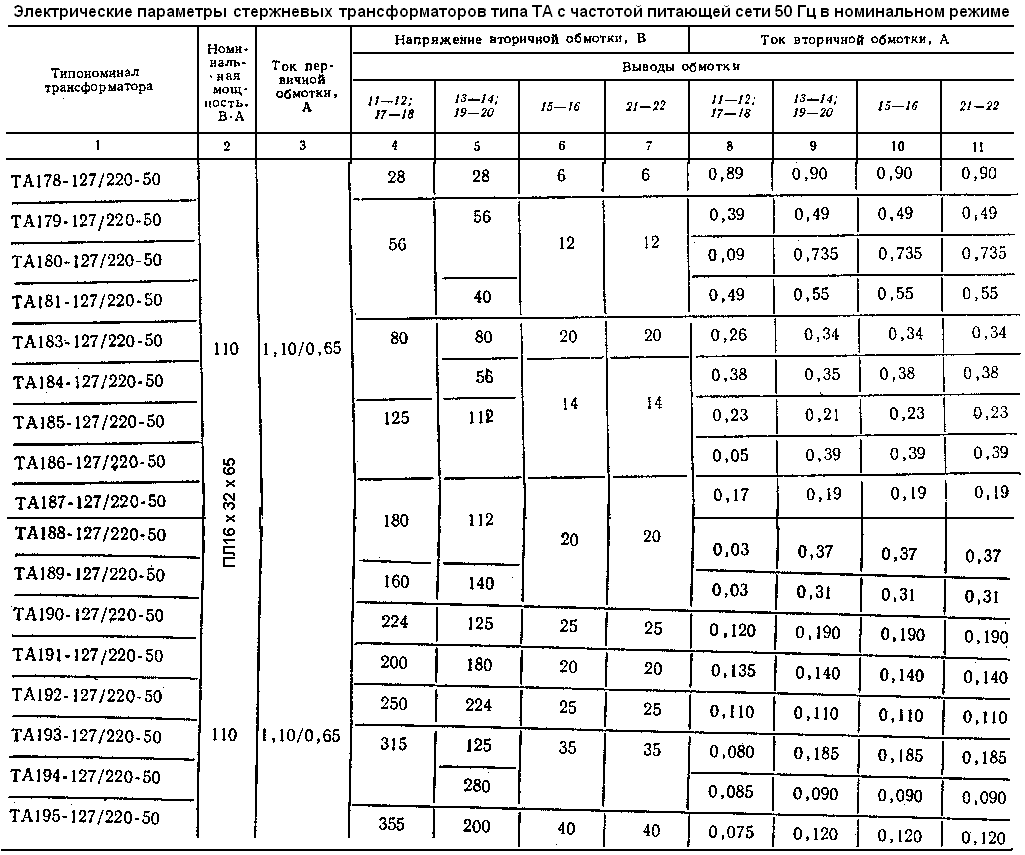 Справочные данные стержневых трансформаторов ТА178 - ТА195