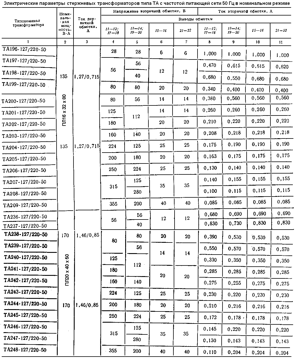 Справочные данные стержневых трансформаторов ТА196 - ТА209, ТА236 - ТА248
