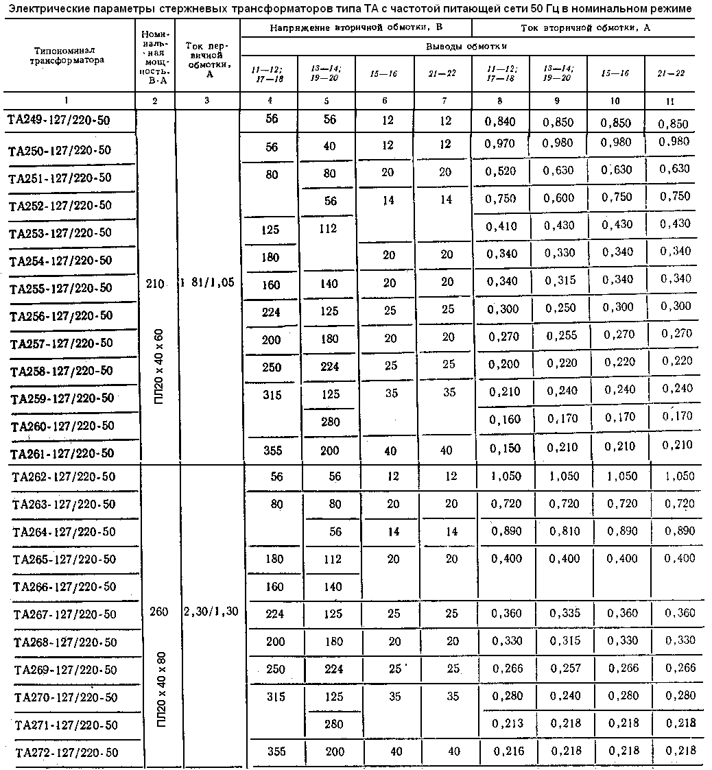 Справочные данные стержневых трансформаторов ТА249 - ТА272