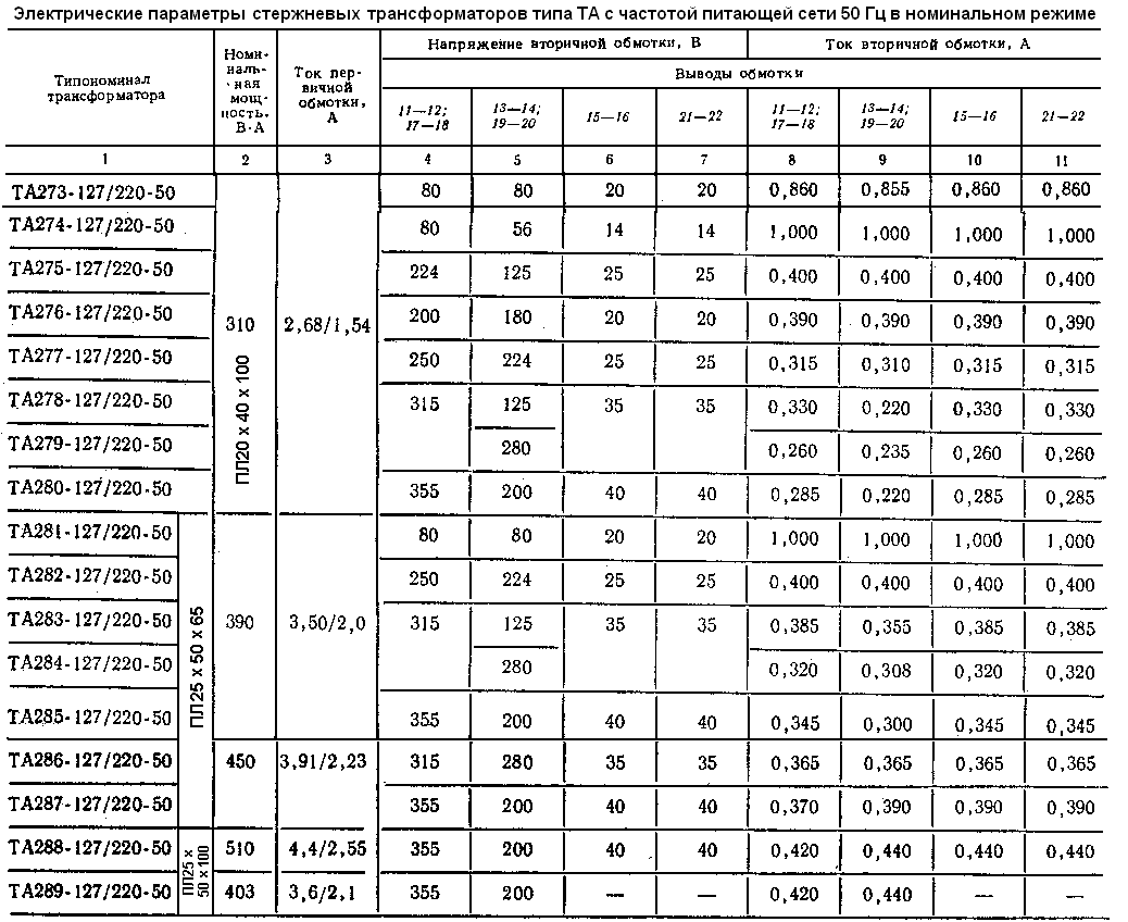 Справочные данные стержневых трансформаторов ТА273 - ТА289