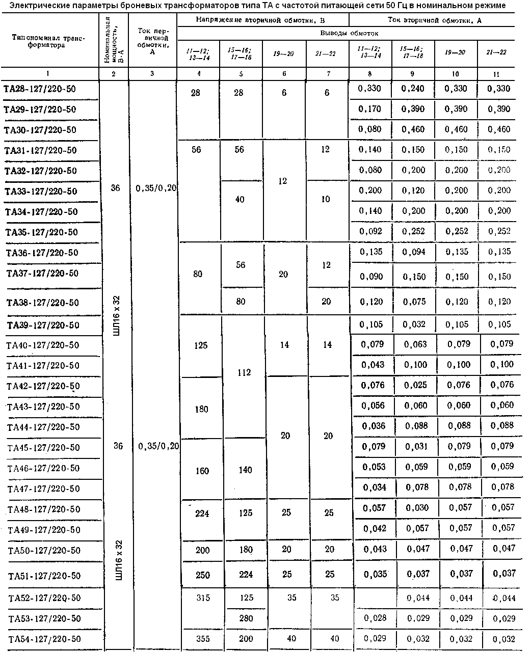 Справочные данные броневых трансформаторов ТА28 - ТА54