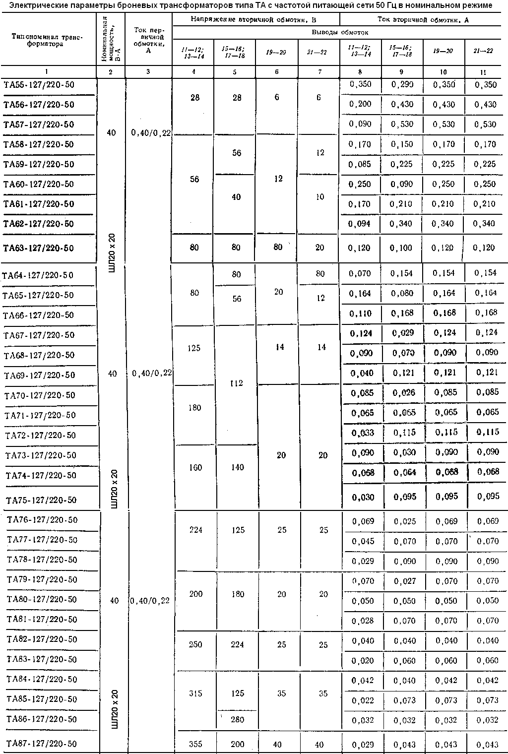 Справочные данные броневых трансформаторов ТА55 - ТА87