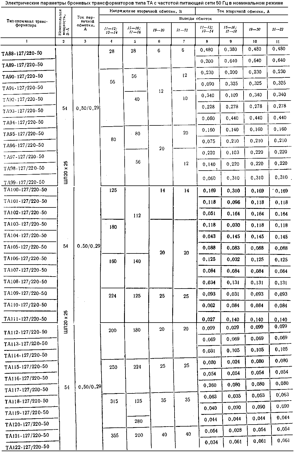 Справочные данные броневых трансформаторов ТА88 - ТА122