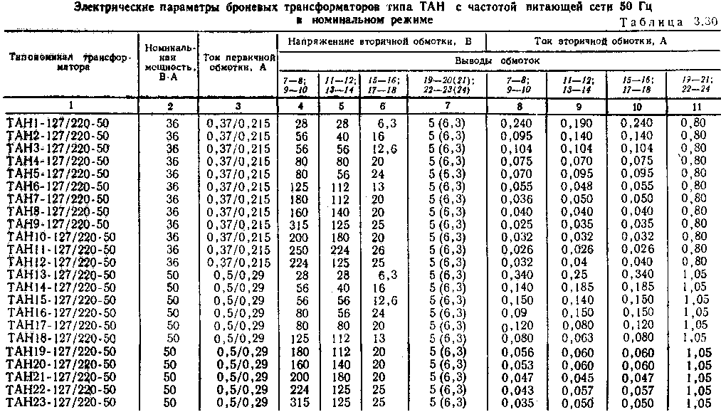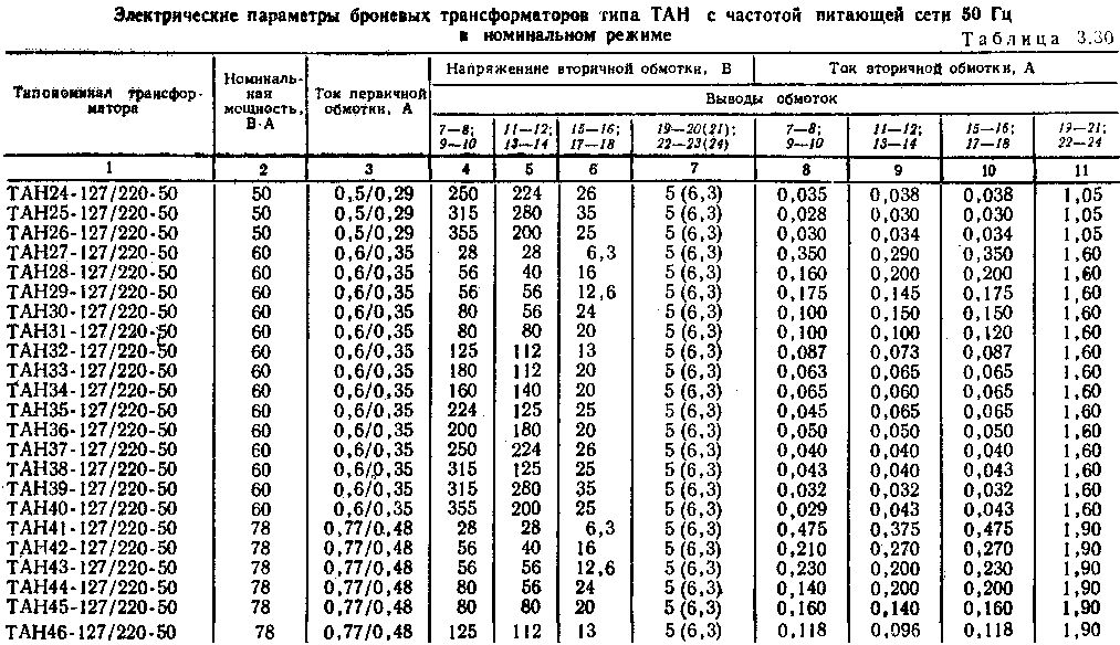 Справочные данные броневых трансформаторов ТАН24 - ТАН46
