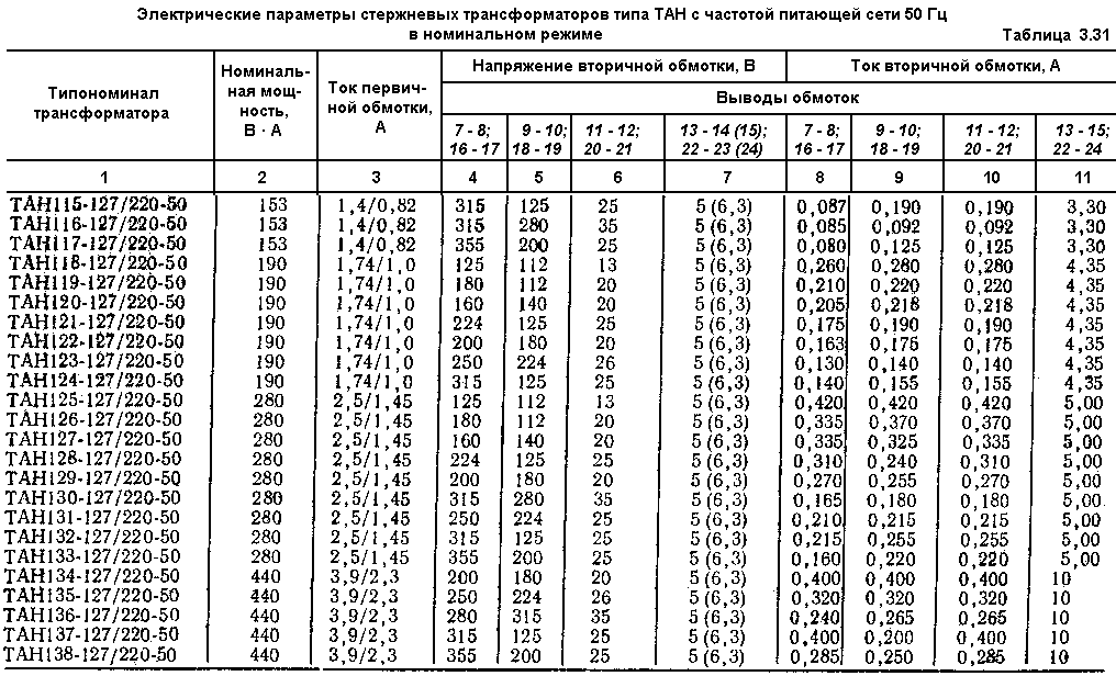 Справочные данные стержневых трансформаторов ТАН115 - ТАН138