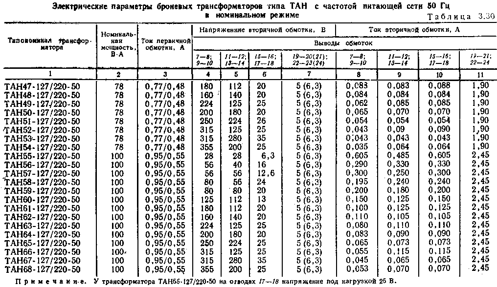 Справочные данные броневых трансформаторов ТАН47 - ТАН68