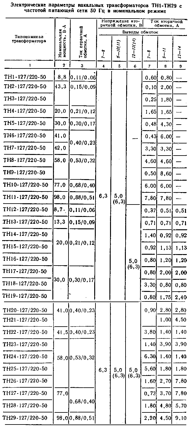Справочные данные броневых трансформаторов ТН1 - ТН29