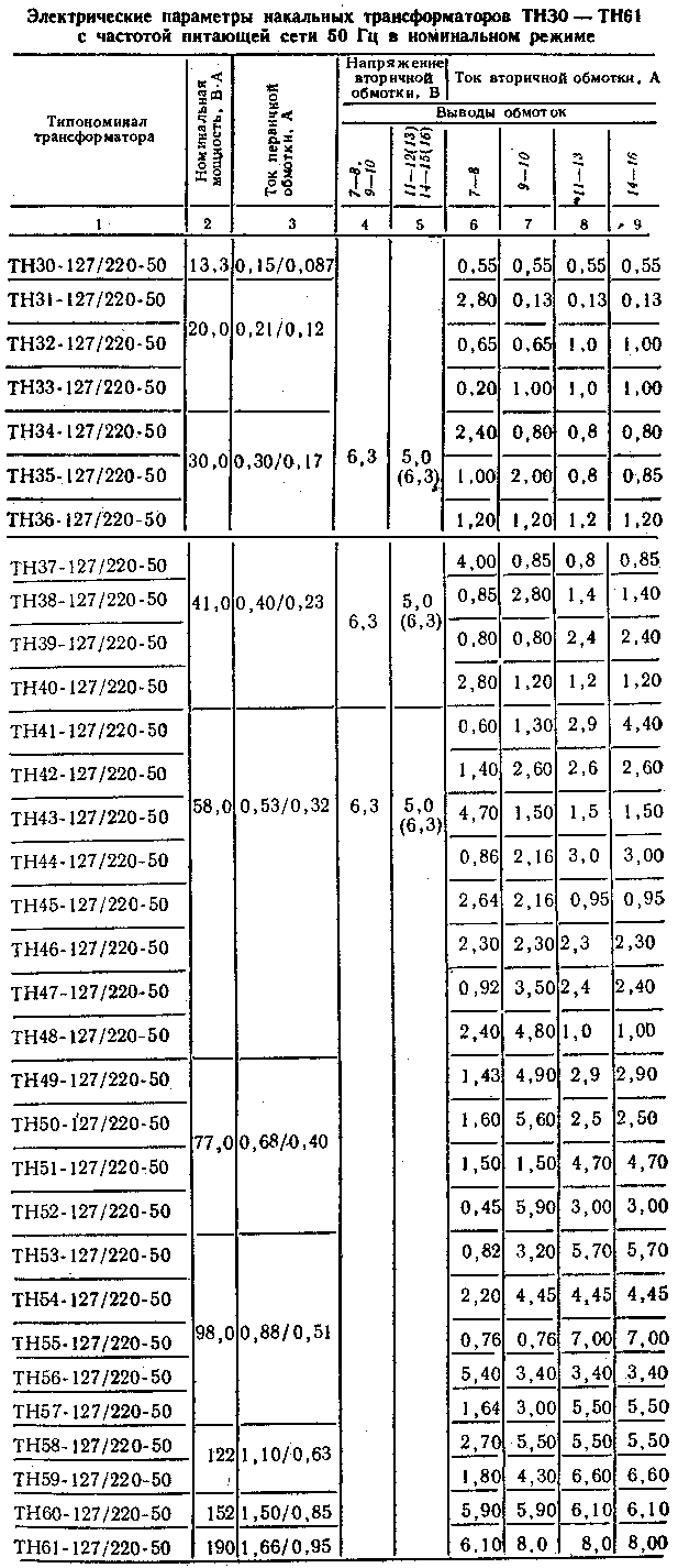 Справочные данные броневых трансформаторов ТН30 - ТН61