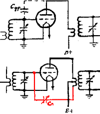 Схема изобретения Хазелтайна: вверху традиционная схема входного каскада приемника на триоде, внизу нейтродин [102].