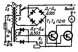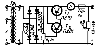 Выпрямитель (рис. 1) собран по мостовой схеме на четырех диодах Д1 - Д4 типа Д305. Регулирование силы зарядного тока производится. при помощи мощного транзистора Т1 включенного по схеме составного триода. При изменении смещения, снимаемого на базу триода с потенциометра R1, изменяется сопротивление цепи коллектор-эмиттер транзистора. Зарядный ток при этом можно изменять от 25 ма до 6 а при напряжении на выходе выпрямителя от 1,5 до 14 в.