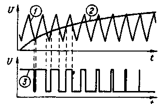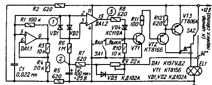 Генератор на операционном усилителе DA1.1 вырабатывает напряжение треугольной формы с частотой 150... 200 Гц (график 1 на рис. 2), которое поступает на неинвертирующий вход ОУ DA1.2. Пока включен дальний свет (в положении ножного переключателя света SA2, показанном на схеме), конденсатор С2 разряжен через резистор R7, диод VD3 и нить ближнего света лампы EL1 (на схеме показана одна лампа из двух) и напряжение на выходе ОУ DA1.2 около 10,5 В. Транзистор VT1 в это время открыт, а транзисторы VT2, VT3 выключены, так как коллектор и эмиттер транзистора VT3 замкнуты контактами переключателя SA2. После переключения дальнего света на ближний спирали дальнего света остаются включенными через открывшиеся транзисторы VT2 и VT3. Конденсатор С2 начинает заряжаться (график 2 на рис. 2) через резисторы R7 и R9. На инвертирующем входе ОУ DA1.2 появляется увеличивающееся напряжение, а на выходе - прямоугольные импульсы с постоянной частотой и увеличивающейся скважностью (график 3). Они соответствующим образом переключают транзисторы VT1--VT3. и действующее значение напряжения на нитях ламп дальнего света плавно уменьшается до нуля. При переключении света с ближнего на дальний конденсатор С2 быстро разряжается через цепь R7VD3. Диоды VD1, VD2 и резистор R6 служат для ограничения напряжения между входами ОУ DA1.2; стабистор VD4 и резисторы RIO, R12 - для надежного закрывания транзисторов. Подстроечный резистор R9 позволяет регулировать время погасания дальнего света в пределах от 1 до 4...5 с. Устройство можно выключить тумблером SA1. Описываемое устройство подключают параллельно ножному переключателю света так, как показано на рис. 1. Сечение соединительных проводов не менее 1.5 мм3. В устройстве использованы резисторы ОМЛТ и СПЗ-16 (R9), конденсаторы КМ-5 и К50-6 (С2). Транзистор ГТ806А можно заменить на любой другой из этой серии или на ГТ701А. Если потребляемый спиралями дальнего света ток не превышает 10 А (двухфарные автомобили с обычными лампами), то вместо ГТ806А могут быть использованы транзисторы П210А, ГТ810А. Вместо транзистора КТ816Б подойдут КТ816В, КТ816Г или ГТ905, ГТ906 с любым буквенным индексом; вместо КТ815Б - КТ815В, КТ815Г. КТ817Б, КТ817В. КТ817Г, КТ801Б. Стабистор КС119А можно заменить тремя последовательно соединенными диодами КД102А или Д220, Д223, КД522А. Заменять микросхему К157УД2 нежелательно, так как она способна работать в широком интервале питающего напряжения. Все детали, кроме тумблера SA1, размешены на плате из стеклотекстолита размерами 110x65х2 мм. Монтаж выполнен с использованием луженых латунных втулок, развальцованных в отверстиях платы. Транзисторы VT2, VT3 установлены на теплоотвод с площадью поверхности не менее 40 см . Собранное устройство закрепляют под приборной панелью слева от рулевой колонки. Сразу после переключения света яркость дальнего света скачком незначительно уменьшается из-за того. что нити ламп оказываются включенными через сопротивление открытого транзистора VT3, а затем лампы плавно гаснут. Устройство можно применить и на автомобилях с напряжением бортовой сети 24 В. Для этого необходимо последовательно с резистором R11 включить резистор ОМЛТ-2 сопротивлением 120 Ом. заменить стабистор КС119А на стабилитрон Д814Г и использовать конденсатор С2 на напряжение 50 В. Устройство было испытано на автомобиле ГАЗ-24 и показало хорошие результаты.