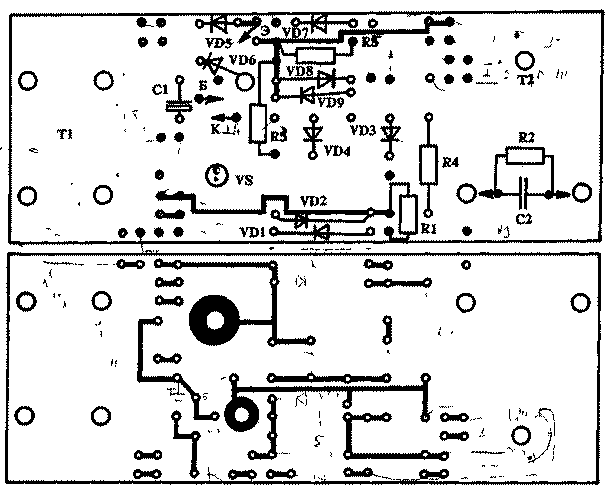 Предлагамое устройство избавит автолюбителей от многих проблем, особенно в зимнее время. Оно не требует внесения изменений в электрическую схему автомобиля и при необходимости позволяет легко вернуться к стандартной системе. Немаловажно и то, что при пониженном наряжении питания бортовой сети (при включении стартера, например) автоматически включается многоискровой режим. Устройство работоспособно при снижении напряжения аккумулятора до б... 6,5 В. На рисунках представлены "печатная" плата с расположением деталей и электрическая схема. Основу последней составляет преобразователь напряжения, собранный на транзисторе VT1 по схеме блокинг-генератора с общим коллектором. Импульсы обратного хода на обмотке IV трансформатора T1 c частотой 2...3 кГц через выпрямитель VD3 заряжают накопительный конденсатор С2. По мере заряда С2 амплитуда обратных импульсов растет и достигает напряжения стабилизации стабилитрона VD6. Через стабилитрон VD6 заряжается конденсатор С1. Временем разряда конденсатора С1 определяется задержка запуска блокинг-генератора. При этом снижается частота колебаний генератора и потребляемый схемой ток. После разряда конденсатора С2 через катушку зажигания и тиристор VS процесс повторяется.