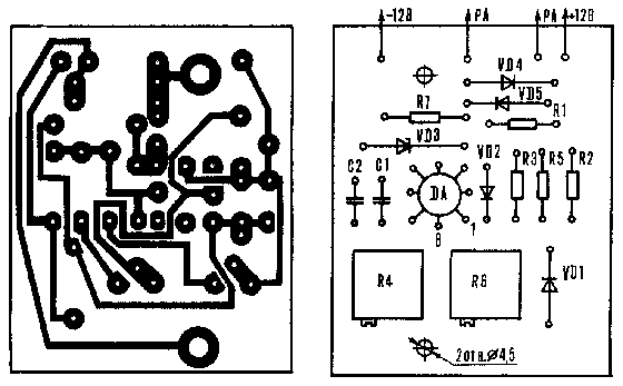 Питается вольтметр непосредственно от объекта измерения. Начальное смещение, относительно которого производится измерение, устанавливается сопротивлением цепочки резисторов R3, R4 (см. принципиальную схему рис.1), а величина обратной связи (определяющая коэффициент усиления ОУDA1 и, соответственно, степень "растяжки" диапазона) задается сопротивлением цепочки резисторов R5, R6. Источник опорного напряжения на стабилитроне VD3 обеспечивает также смещение потенциала на неинвертнрующем входе DA на величину, равную приблизительно половине измеряемого падения напряжения, что необходимо для работы ОУ с однополярным питанием. Сопротивление резистора R7 зависит от чувствительности микроамперметра РА и величины максимального выходного напряжения операционного усилителя относительно катода стабилитрона VD3. Диоды VD1, VD2 обеспечивают защиту ОУ, a VD4, VD5 - микроамперметра от перегрузки по току. VD1 запрещает прохождение тока отрицательной полярности через резистор R1 и операционный усилитель. Возможно прохождение тока через стабилитрон VD3, смещенный в прямом направлении, диод VD2 и резисторы R2-R4. Тем самым между входами DA (выводы 3,2) установится разность потенциалов не более 0,7 В. Аналогичное падение напряжения будет на выводе 3 относительно вывода 4 ОУ. Таким образом обеспечивается надежная защита ОУ от ошибки при подключении полярности. В вольтметре применены постоянные резисторы типа МЛТ, в качестве подстроенных желательно использовать многообортные типа СП5-2, СП5-3, СП5-14. Допустимо использовать и другие типы ОУ, например, К140УД7 или К140УД1А, К553УД1 с соответствующими цепями коррекции. Диоды - любые маломощные кремниевые. Стабилитрон КС147А можно заменить на КС156А, но, вероятно, тогда ухудшится температурная стабильность вольтметра и потребуется уточнить номиналы резисторов R1-R3. Микроамперметр - М906 или М24 с током полного отклонения 50 мкА и шкалой, соответствующей выбранной зоне измерения. Возможно применение и других стрелочных приборов с током полного отклонения до 1 мА, но в этом случае необходимо подобрать величину резистора R5, исходя из выбранного значения падения напряжения на нем (около 1,5 В). Можно также использовать авометр в режиме микроамперметра. Тогда данное устройство будет выполнено в виде приставки к тестеру. При отсутствии дефектных элементов и ошибок в монтаже налаживание вольтметра сводится к его калибровке. Данную операцию выполняют с помощью регулируемого источника питания с выходным напряжением 9-16 В и образцового вольтметра, желательно цифрового, например В7-16, ФЗО, ВР-11. Подстроечные резисторы устанавливают в среднее положение и на вход вольтметра подают напряжение 12-13 В, контролируя его по образцовому прибору. Стрелка налаживаемого вольтметра должна отклониться от нулевого значения. Затем на выходе источника питания устанавливают напряжение 10 В (±0,05 В) и резистором R4 переводят стрелку вольтметра на нулевое деление шкалы. После чего, увеличив измеряемое напряжение до 15 ± 0,05 В, резистором R6 устанавливают стрелку на конечное деление шкалы. Повторив указанные операции для 10 В и 15 В, добиваются наиболее точной настройки вольтметра в рабочем диапазоне 13-14,5 В. Во время налаживания реле-регулятора напряжение измеряют непосредственно на клеммах аккумулятора. На рис.2 приведена печатная плата со схемой расположения элемент
