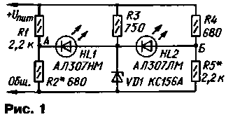 Резисторы R2 и R5 подобраны так, что при напряжении питания 14 В напряжение в точке А меньше, чем на стабилитроне VD1 на 1,5 В, и "зеленый" светодиод HL1 светит с половинной яркостью. Напряжение в точке Б превышает напряжение на стабилитроне VD1 на 1.5 В, и яркость "красного" светодиода HL2 тоже равна половине номинальной. Оба светодиода светят так при напряжении питания в пределах 14±0,5 В, что соответствует номинальному режиму бортовой сети автомобилей "Жигули". Если напряжение в сети увеличилось до 14,6 В, напряжение в точках А и Б соответственно увеличивается по сравнению с напряжением на стабилитроне VD1, что приводит к увеличению яркости свечения светодиода HL2 и погасанию HL1. В случае уменьшения напряжения в сети до 13,4 В светодиод HL1, наоборот, светит ярче, a HL2 гаснет. Таким образом, по цвету и яркости свечения светодиодов можно судить о напряжении сети с довольно большой точностью. Относительный недостаток этого индикатора — некоторая сложность его налаживания из-за того, что изменение сопротивления одного из подборочных резисторов приводит к изменению яркости свечения одновременно обоих светодиодов. Для налаживания пробника на него подают напряжение 14В. Если при этом напряжение на стабилитроне VD1 равно 5,6 В, подборкой резистора R2 устанавливают напряжение в точке А равным 4,1 В и контролируют включение светодиода HL1. Затем подбирают резистор R5 до напряжения 7,1 В в точке Б и контролируют включение светодиода HL2. Изменяют напряжение питания до 13,4 В, контролируют погасание светодиода HL2. При напряжении 14,6 В должен погаснуть светодиод HL1. Резисторы в пробнике могут быть любого типа мощностью 0,125 Вт. Стабилитрон лучше применить миниатюрный — КС156П КС409А, 2С156Б.