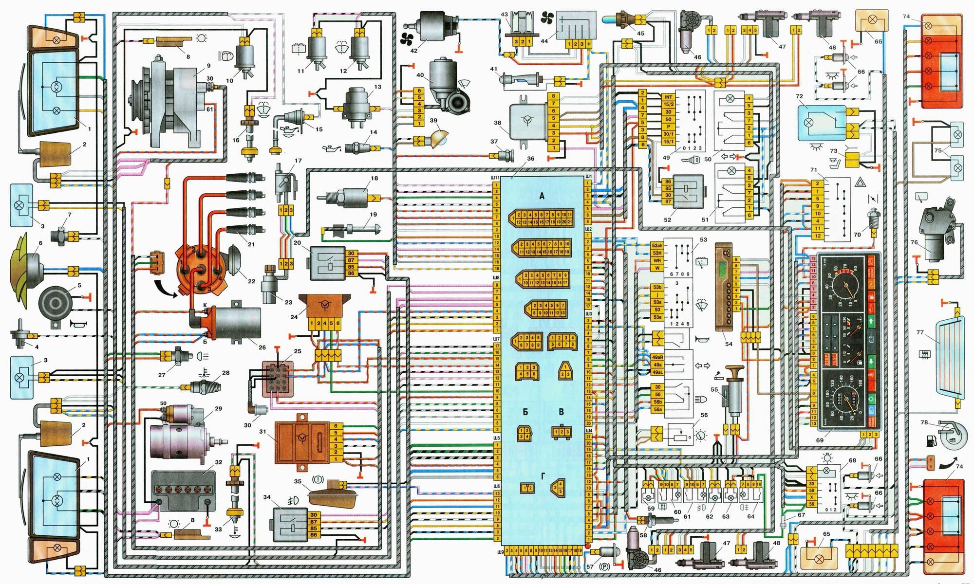 1 - блок фара; 2 - электродвигатели очистителей фар ваз 21099; 3 - противотуманные фары; 4 - выключатель подкапотной лампы; 5 - звуковой сигнал; 6 - электродвигатель вентилятора системы охлаждения двигателя; 7 - датчик включения электродвигателя вентилятора; 8 - датчик износа колодок передних тормозов; 9 - генератор ваз 21099; 10 - электромагнитный клапан включения омыва фар ваз 21099; 11 - электромагнитный клапан включения омыва заднего стекла; 12 -электромагнитный клапан включения омыва ветрового стекла ваз 21099; 13 - электродвигатель омывателя стекол; 14 - датчик контрольной лампы давления масла; 15 - датчик уровня масла; 16 - датчик уровня омывающей жидкости; 17 - датчик расхода топлива ваз 21099; 18 - электромагнитный клапан карбюратора ваз 21099; 19 - концевой выключатель карбюратора; 20 - реле включения стартера ваз 21099; 21 - свечи зажигания ваз 21099; 22 - датчик-распределитель зажигания; 23 - датчик скорости автомобиля; 24 - блок управления электромагнитным клапаном карбюратора ваз 21099; 25 - колодка диагностики; 26 - катушка зажигания ваз 21099; 27 - выключатель света заднего хода; 28 - датчик указателя температуры охлаждающей жидкости; 29 - стартер ваз 21099; 30 - датчик верхней мертвой точки 1-го цилиндра; 31 - коммутатор ваз 21099; 32 - аккумуляторная батарея; 33 - датчик уровня охлаждающей жидкости; 34 - реле включения противотуманных фар; 35 - датчик уровня тормозной жидкости; 36 - монтажный блок ваз 21099; 37 - штепсельная розетка для переносной лампы; 38 - блок управления блокировкой замков дверей; 39 - подкапотная лампа; 40 - электродвигатель очистителя ветрового стекла; 41 - лампа освещения вещевого ящика; 42 -электродвигатель вентилятора отопителя; 43 - дополнительный резистор электродвигателя отопителя; 44 - переключатель вентилятора отопителя; 45 - лампа подсветки рычагов отопителя; 46 - моторедукторы электростеклоподъемников передних дверей; 47 - моторедукторы блокировки замков передних дверей; 48 - моторедукторы блокировки замков задних дверей; 49 - выключатель зажигания ваз 21099; 50 - переключатель электростеклоподъемника правой двери; 51 - переключатель электростеклоподъемника левой двери; 52 - реле зажигания; 53 - подрулевой переключатель; 54 - маршрутный компьютер ваз 21099; 55 - прикуриватель; 56 - регулятор освещения приборов ваз 21099; 57 - выключатель контрольной лампы стояночного тормоза; 58 - выключатель стоп-сигнала; 59 - контрольная лампа включения обогрева заднего стекла; 60 - выключатель обогрева заднего стекла; 61 - выключатель противотуманных фар; 62 - контрольная лампа включения противотуманных фар; 63 - контрольная лампа включения заднего противотуманного света; 64 - выключатель заднего противотуманного света; 65 -боковые указатели поворота; 66 - выключатели плафона на стойках дверей (на ваз-21093 и ваз-21099); 67 - предохранитель цепи противотуманного света; 68 - выключатель наружного освещения; 69 - панель приборов ваз 21099; 70 - выключатель контрольной лампы воздушной заслонки карбюратора; 71 - выключатель аварийной сигнализации; 72 - плафон; 73 - разъем для подключения к плафону индивидуального освещения; 74 - задние фонари; 75 - фонари освещения номерного знака; 76 -электродвигатель очистителя заднего стекла; 77 - элемент обогрева заднего стекла; 78 - датчик указателя уровня и резерва топлива