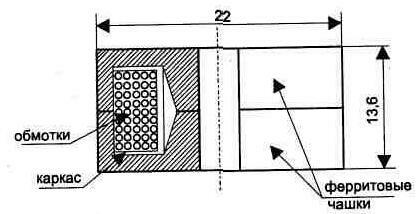 Иногда для питания различных радиотехнических устройств требуется иметь два двухполярных напряжения +12 и -12 В (или +9 и -9 В) от одного источника — аккумулятора или сетевого трансформатора с одной обмоткой. Такие напряжения необходимы для работы операционных усилителей и некоторых других схем. При этом основное потребление тока схемой осуществляется, как правило, по цепи с положительным напряжением, а цепь "—" является вспомогательной. Промышленность выпускает специализированную микросхему преобразователя для получения отрицательного напряжения: КР1168ЕП1 (входное напряжение 3...10 В, а выходное отрицательное такой же величины, что и на входе). Но она не является пока широкодоступной, а также перекрывает узкий диапазон напряжений. Рис. 5.4 На рис. 5.4 приведена схема простого преобразователя, который позволяет получать от источника +12 В (+9 В) дополнительное стабилизированное напряжение -12 В (-9 В при использовании стабилизатора КР142ЕН8А). Ток нагрузки по цепи -12В может быть до 15 мА. Преобразователь работает на частоте 50 кГц и сохраняет свою работоспособность при снижении напряжения питания до 7 В. Рис. 5.5 Рис. 5.6. Конструкция трансформатора Т1 Схема состоит из автогенератора на транзисторе VT1, повышающего напряжение трансформатора Т1 и интегрального стабилизатора DA1. При сборке требуется соблюдать полярность подключения фаз обмоток трансформатора Т1, указанную на схеме. Со вторичной обмотки трансформатора напряжение после выпрямления должно быть 15...19 В, что необходимо для нормальной работы стабилизатора DA1. Для настройки преобразователя сначала вместо DA1 подключаем резистор 150 Ом. При нормальной работе схемы форма напряжения на обмотке 3 в трансформаторе Т1 показана на рис. 5.5, При настройке может потребоваться подбор конденсатора СЗ и резистора R2. Трансформатор Т1 выполняется на броневом сердечнике типоразмера Б22 из феррита 2000НМ (1500НМ) и содержит в обмотке 1 — 80 витков, 2 — 15 витков, 3—110 витков провода ПЭЛШО-0,18 (рис. 5.6). После проверки и настройки схемы катушку и ферритовые чашки закрепить клеем.