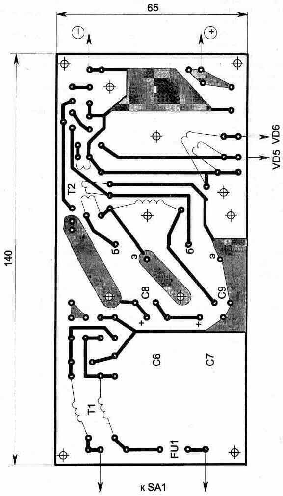 Применение импульсного преобразователя напряжения позволяет уменьшить габариты и вес источника питания, что особенно важно для переносных конструкций. Рис. 5.9. Импульсный преобразователь напряжения Преобразователь (рис. 5.9), предназначен для питания от сети 220 В устройств с потребляемым током до 3 А при Uвых=9,2 В (для получения из этого напряжения 5 или 6 В можно использовать любую типовую схему линейного стабилизатора). Предложенный преобразователь отличается от аналогичных простотой и наличием защиты источника питания от перегрузки по выходной цепи в случае короткого замыкания. Электрическая схема устройства состоит из входного фильтра (элементы С1, С2, СЗ и Т1); цепи запуска (R2, R3, R4, С4, VT1); автогенератора (VT2, VT3, Т2, ТЗ, С5); выпрямителя пониженного напряжения (VD5, VD6, С12, С13). Преобразователь собран по полумостовой схеме. Входной фильтр преобразователя обеспечивает ослабление помех начиная с частоты 15 кГц более чем в 2 раза. В цепи запуска используется транзистор VT1 в режиме обратимого пробоя, что позволяет формировать короткие импульсы, которые необходимы в момент включения схемы для запуска работы ключевого каскада VT2, VT3 в режиме автогенератора на частоте 30...60 кГц, при этом рабочую частоту, в небольших пределах, можно изменять емкостью С5. В случае замыкания в цепи вторичной обмотки трансформатора ТЗ обратная связь в автогенераторе нарушается и генерация срывается до момента устранения неисправности. КПД преобразователя при токе нагрузки 2 А составляет 0,74 (при токе 4 А—0,63). В устройстве могут быть использованы резисторы любого типа, конденсаторы С1 типа К73-17 на 630 В; С2, СЗ типа К73-9 или К73-17 на 250 В; С4, С5 типа К10-7; С6, С7 типа К50-35 на 250 В ; С8, С9 типа К73-9 на 250 В; С10...С12 типа К10-17; С13 типа К52-1В на 20 В. Транзистор VT1 можно заменить на КТ312А, Б, В, транзисторы VT2 и VT3 на КТ838А, КТ846В. Дроссель Т1 намотан на двух склеенных вместе кольцевых сердечниках типоразмера К20х12х6 из феррита марки 2000НМ. Обмотки 1 и 2 содержат по 45 витков провода ПЭВ-2 диаметром 0,25 мм. Трансформатор Т2 выполнен на двух склеенных вместе кольцевых сердечниках типоразмера К10х6х3 из феррита 2000НМ. Обмотка 1 содержит 60 витков, обмотки 2 и 3 — по 15 витков провода ПЭЛШО-0,15 (отвод в обмотке 2 для обратной связи по току от третьего витка). Для изготовления ТЗ применен кольцевой сердечник К28х16х9 (2000НМ). Обмотка 1 наматывается 250 витками проводом ПЭВ-2 0,25, обмотки 2 и 3 — 22 витками проводом ПЭВ-2 диаметром 0,51 мм. При изготовлении трансформаторов перед намоткой провода необходимо закруглить надфилем острые края сердечников и обернуть их лакотканью. Намотку проводить виток к витку с последующей изоляцией каждого слоя (лучше использовать фторопластовую ленту толщиной 0,1 мм). Применяемые диоды VD1...VD4 могут быть заменены на любые высоковольтные, замена диодов VD5 и VD6, кроме как на КД2998В, другим типом не рекомендуется. Наибольшее тепловыделение в схеме происходит на выпрямительных диодах VD5, VD6, и их необходимо устанавливать на радиатор. Остальные детали схемы в теплоотводе не нуждаются. Конструктивно все элементы схемы, кроме включателя S1 и диодов VD5, VD6, размещены на односторонней печатной плате размером 140х65 мм. Топология печатной платы приведена на рис. 5.10. Перед первоначальным включением преобразователя необходимо проверить фазы обмоток в цепях базы VT2 и VT3 на соответствие схеме. Если преобразователь при прави