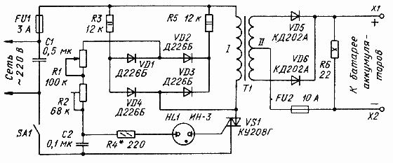 В промышленных зарядных устройствах для выпрямления зарядного тока и изменения его значения иногда применяют тринисторы КУ202Г. Здесь следует заметить, что прямое напряжение на включенных тринисторах при большом зарядном токе может достигать 1,5 В. Из-за этого они сильно нагреваются, а по паспорту температура корпуса тринистора не должна превышать +85°С. В таких устройствах приходится принимать меры по ограничению и температурной стабилизации зарядного тока, что приводит к дальнейшему их усложнению и удорожанию. Описываемое ниже сравнительно простое зарядное устройство имеет широкие пределы регулирования зарядного тока - практически от нуля до 10 А - и может быть использовано для зарядки различных стартерных батарей аккумуляторов на напряжение 12 В. В основу устройства (см. схему) положен симисторный регулятор, опубликованный в [2], с дополнительно введенными маломощным диодным мостом VD1 - VD4 и резисторами R3 и R5.