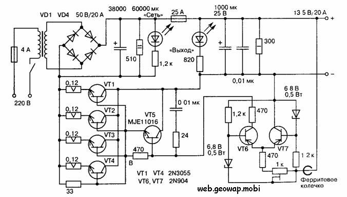 ![]() Вторичная обмотка трансформатора должна быть рассчитана на ток 20 А и напряжение 20 В. Диоды моста устанавливаются на радиаторах, лучше использовать силовые диоды с барьером Шоттки. ![]() Стабилизатор с защитой от замыканий выполнен на транзисторах ЧТ1. VT7. Выходное напряжение устанавливается подстроечным резистором. Усилитель сигнала ошибки выполнен на дифференциальном каскаде УТ6, УТ7. Повторитель на составном транзисторе УТ5 управляе
