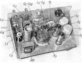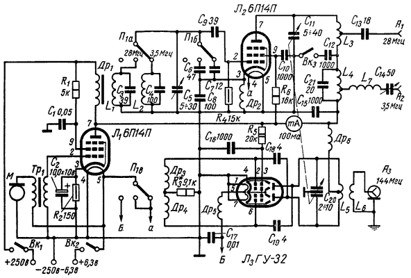 Рис.1. Принципиальная схема передатчика Передатчик на диапазоны 3,5 и 28 МГц собран по двухкаскадной схеме с электронной связью. Такая схема гарантирует достаточно высокую стабильность частоты и поэтому находит широкое применение в любительской аппаратуре. В цепь управляющей сетки лампы Л2 (6П14П) переключателем П1а включают один из колебательных контуров L1C3C5C6C8 или L2C4C5C7C8. Функции анода задающего генератора (ЗГ) выполняет экранирующая сетка, режим работы генератора определяется величиной сопротивления R6. Цепь положительной обратной связи (ПОС), необходимой для возбуждения незатухающих колебаний в контуре, состоит из конденсаторов емкостного делителя С6С8 или С7С8, к части которого подключен катод лампы Л2. Настраивают ЗГ переменным конденсатором С5. Общая емкость делителей С6С8 или С7С8 определяет величину перекрытия соответствующего диапазона. Напряжение, генерируемое ЗГ, усиливается. На его частоту настроен колебательный контур L3L4C11 в анодной цепи, причем при работе передатчика в диапазоне 3,5 МГц контур настраивается на вторую гармонику частоты генерируемого напряжения 1,75...1,83 МГц. Связь с антенной автотрансформаторная. Последовательно с антенной включены удлиннительная катушка L7 и укорачивающий конденсатор С14, позволяющие работать как с укороченной, так и с удлиненной антеннами. На диапазоне 28 ...29,7 МГц передатчик также работает в режиме удвоения частоты. Анодный контур L3C11 настраивают на вторую гармонику частоты генерируемого напряжения 14...14,85 МГц. При переходе на второй диапазон (тумблер Вк3) конденсаторы С12С15 закорачивают по высокой частоте катушку индуктивности L4. На диапазоне 28 МГц используется четвертьволновая штыревая антенна. Связь с антенной емкостная, через конденсатор С13. Режим удвоения на обоих диапазонах 3,5 и 28 МГц применен для повышения стабильности частоты передатчика. Выходные контуры и антенну настраивают по милиамперметру. Кроме того милиамперметром измеряют анодный ток ламп Л2, Л3. На диапазоне 144 МГц передатчик работает по двухтактной схеме автогенератора на лампе Л3 (ГУ-32). Эта лампа находится в облегченном режиме, что дает более высокую стабильность частоты. Колебательный контур автогенератора L5C20 настраивают на соответствующую частоту переменным конденсатором С20. Связь с антенной индуктивная (катушка связи L6). Модулятор выполнен на лампе Л1 (6П14П). Это усилитель НЧ с дроссельным выходом. В сеточную цепь лампы через трансформатор Тр1 (коэффициент трансформации 1:20) включен низкоомный угольный микрофон. В передатчике применена анодно-экранная модуляция. Конструкция и детали Шасси (140х200 мм) и ящик передатчика (145х150х260 мм) изготовлены из листового алюминия толщиной 1,5 мм, передняя панель - из алюминия толщиной 2,5 мм. Последняя скреплена с шасси уголками. Размещение деталей передатчика на шасси показано на рис.2, 3.