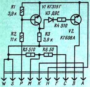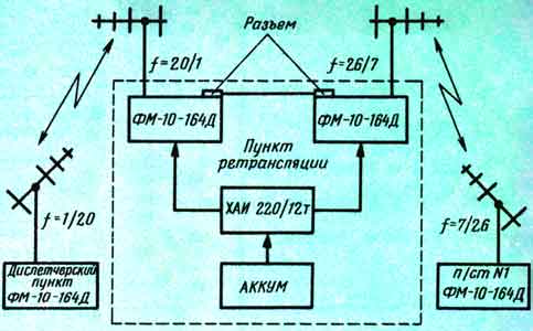Недостатком низовой УКВ радиосвязи является ограниченная дальность, влияние рельефа местности на распостранение радиоволн УКВ диапазона Для увеличения дальности действия УКВ радиосвязи часто используют ретрансляцию излучаемых сигналов. Рассмотрим принцип построения ретрансляторов на линиях низовой связи с использованием УКВ станций серии ФМ производства ВНР. Радиостанции ФМ выпускаются для работы в дуплексном или симплексном режиме на заданных частотах в диапазоне 160-170 МГц. При дуплексном и двухчастотном симплексном режимах разница частот прием/передача составляет 4,5-5,7 МГц. Номинальная мощность передатчика - 10 Вт. Для работы в режиме ретрансляции радиостанции этой серии комплектуются пультами ФК-51 или ТЖА-4. Однако они громоздки и неудобны в эксплуатации. На рис. 1 изображена схема простейшего устройства, позволяющего осуществить на одной радиостанции полудуплексную ретрансляцию без применения таких пультов. Детали устройства монтируют на контактах разъема внешнего кабеля радиостанции.