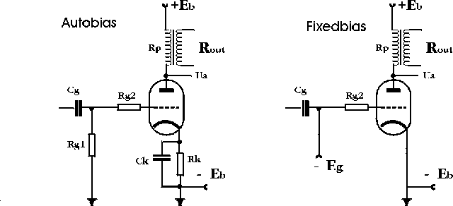 Один из простейших методов расчета схемы простого триодного усилителя - это открыть инструкцию на лампу, в которой содержатся данные на триод, который вы хотите использовать. Там должен быть пример использования этой лампы со всеми предрасчитанными (рекомендуемыми производителем) параметрами, такими как Rp, Rk, Rg, Ck, Cg – данными для класса А лампы. Все, что вы должны сделать, это выбрать соответствующий трансформатор с правильным сопротивлением нагрузки и коэффициентом трансформации для согласования с громкоговорителем, и выходной каскад готов. Базовая схема однотактного усилителя мощности с общим катодом показана ниже. Первая схема с автоматическим смещением требует несколько больше пассивных элементов по сравнению со схемой с фиксированным смещением и Ug фиксировано только для режима покоя лампы, в режиме усиления сигнала Eg (Ug) является "плавающим" т.е. зависит от входного сигнала. Достоинство - при правильно рассчитанном Rk ток лампы устанавливается автоматически, лампа менее критична к изменению питающего напряжения. Недостаток – ухудшение артикуляции баса, вследствие ограничения на резисторе мгновенного значения тока протекающего через лампу. Схема с фиксированным смещением требует отдельного источника, чтобы обеспечить сетку напряжением -Eg. Недостаток – требует настройки анодного тока лампы, более критична к изменению питающего напряжения. Достоинство – лучшее звучание, чем в схеме с автоматическим смещением. Вне зависимости от того, какую схему вы выберете, вы должны остаться внутри ограничений по параметру Eg – оптимальному для своего класса.