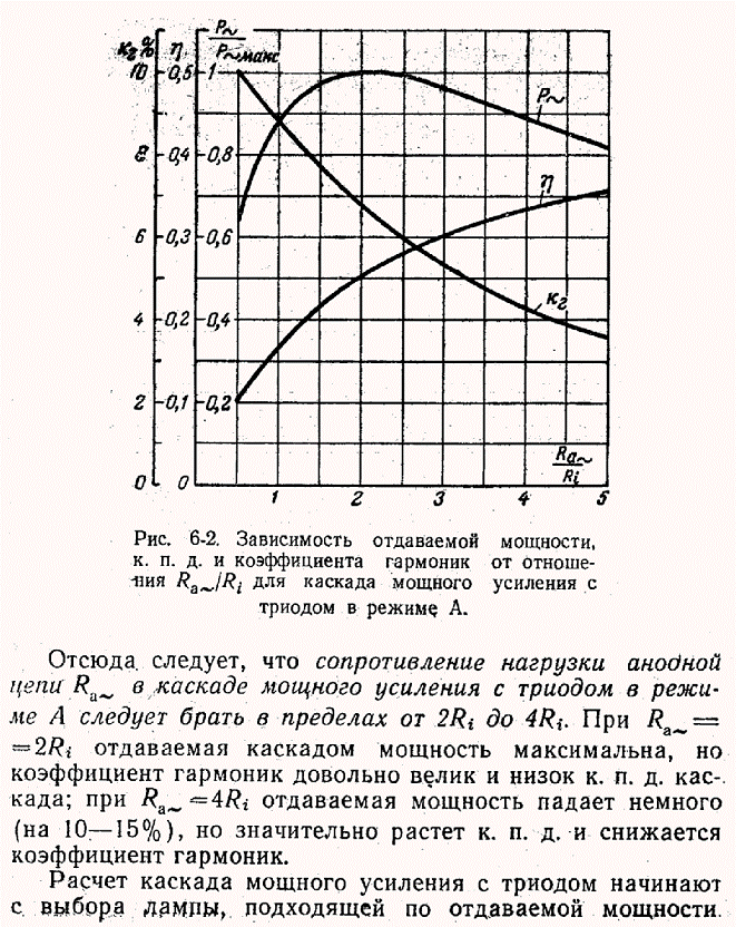 Если Вам не повезло, Вас не устраивает рекомендации производителя и Вы хотите получить большую мощность, либо уменьшить искажения, то можно попытаться рассчитать однотактный триодный усилитель по графикам. Для этого понадобится семейство вольт-амперных характеристик Вашей лампы, постарайтесь их найти в справочниках. В ином случае можно самостоятельно получить их путем измерения – это конечно займет некоторое время, да и вряд ли это занятие для начинающих. Итак, если необходимые характеристики найти невозможно, то все, что придется сделать, это измерить ток анода для разных напряжений на аноде при постоянном напряжении на сетке и записать эти значения. С помощью этих данных вы можете построите вольт-амперные характеристики на бумаге, если конечно на это хватит терпения и желания. Ниже Вы увидите, как это должно выглядеть. Моя цель – это упростить все насколько это возможно. На графике из учебника приведены зависимости выходной мощности, коэффициента гармоник и КПД в зависимости от анодной нагрузки лампы. Можно наблюдать, что уменьшение выходной мощности происходит линейно, коэффициента нелинейных искажений – по экспоненте, и при соотношении Ra/Ri > 5 его дальнейшее уменьшение незначительно. Также, при чрезмерном увеличении отношения Ra/Ri наблюдается ухудшение АЧХ в области ВЧ и снижение динамики каскада.