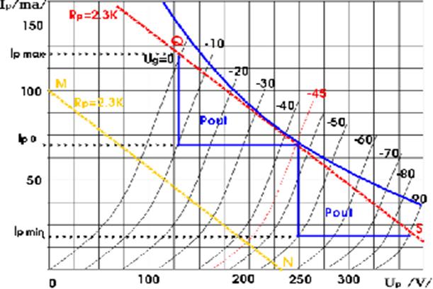 По вертикальной оси отображен ток анода - Ip, По горизонтальной оси – напряжение анода - Up, Черные кривые показывают зависимость Ip и Up для различных значений напряжения сетки - Ug. Синяя кривая показывает максимальную мощность рассеяния лампы – выше этой кривой лампа будет работать с перегрузкой и выйдет из строя. Желтая вспомогательная линия между точками M-N поможет определить наклон линии нагрузки. Красная линия между точками Q-S параллельная желтой линии и есть линия нагрузки. Однако любая линия, параллельная желтой линии M-N может быть выбрана как линия нагрузки. Как же ее нарисовать?
