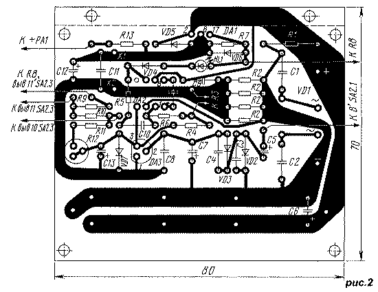 Микросхему КР1168ЕН6Б можно заменить на аналогичную с индексом А, на MC79L06 с индексами BP, CP и ACP, а также на КР1162ЕН6А(Б) (см. статью: Нефедов А., Валявский А. "Микросхемные стабилизаторы серии КР1162" в "Радио", 1995, #4), КР1179ЕН06, AN7906, µA7906, но у них габариты и расстояние между выводами больше (как у КР142ЕН12А). Цоколевка совпадает. Микросхема К140УД6 заменима на КР140УД608, К140УД7, КР140УД708. Светодиод может быть любого типа красного свечения. Резистор R2 - четыре параллельно соединенных С2-29B 2 Ом, 0.125 Вт. К точности его сопротивления никаких требований нет, поэтому резистор можно изготовить и самостоятельно из отрезка высокоомного провода. Резистор R12 - СП3-19а. Остальные элементы - те же, что и в основном варианте блока, аналогично и конструктивное оформление. Чертеж печатной платы приведен на рис.2. Сопротивления резисторов R3 и R4 могут отличаться от указанных на схеме в два раза, важно лишь, чтобы их соотношение было 1:10. Резистор R3 можно также заменить на два последовательно включенных, причем сопротивление второго должно составлять 5...10% от первого, это облегчит точную установку тока ограничения. При настройке блока подборкой резистора R7 устанавливают выходное напряжение 20 В и регулировкой R12 - 0 В. Поскольку эти операции взаимозависимы, их надо повторить несколько раз. В режиме стабилизатора тока переключатель SA2 следует устанавливать в положение, соответсвующее минимальному напряжению, при котором обеспечивается необходимый ток нагрузки. Блок будет стабилизировать ток и при большем напряжении, но мощность, выделяемая на микросхеме DA1, превысит предельно допустимую (10...12 Вт), и может сработать тепловая защита, встроенная в микросхему DA1.