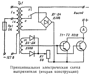 Первая конструкция. Выпрямитель (рис. 1) собран по мостовой схеме на четырех диодах Д1—Д4 типа Д305. Сила зарядного тока регулируется при помощи мощного транзистора Т1, включенного по схеме составного триода. При изменении смещения, снимаемого на базу триода с потенциометра R1, изменяется сопротивление цепи коллектор — эмиттер транзистора. Зарядный ток при этом можно изменять от 25 мА до 6 А при напряжении на выходе выпрямителя от 1,5 до 14 В.