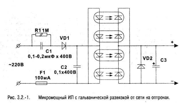 сетью, можно питать через гасящий конденсатор или резистор, при этом