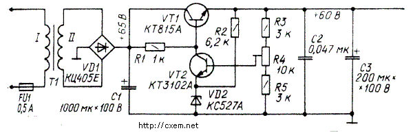Этот стабилизатор был разработан для питания мини АТС на 10 номеров. Выходное напряжение 55...65 Вольт, ток нагрузки до 100 mA.
