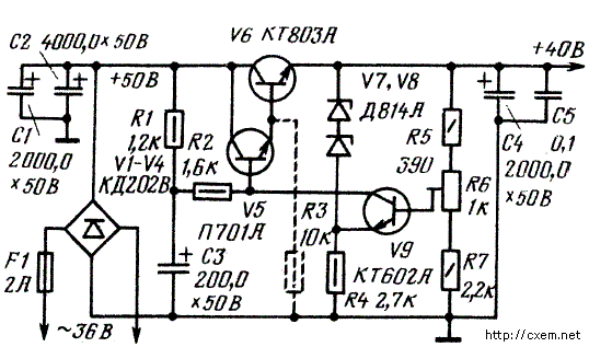 Этот источник питания применялся для питания любительского усилителя мощности ЗЧ и имеет неплохие параметры: выходное напряжение 40В, ток нагрузки 1,2А, коэффициент стабилизации >100.