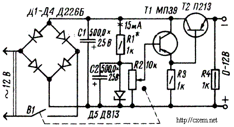 В выпрямителе можно использовать любые мощные диоды (не забывать про максимально допустимый ток вторичной обмотки трансформатора). Переменный резистор R2 - с выключателем питания, желательно с линейной шкалой (группы А). Вместо транзистора МП39 можно использовать транзисторы МП40-МП42, а вместо П213-транзисторы П214,П215. Коэффициент усиления транзисторов должен быть не менее 15. Стабилитрон Д813 можно заменить стабилитронами