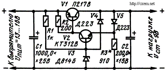 недостаток стабилизатора заключается в том, что порог ограничения тока нагрузки его устройства защиты зависит от статического коэффициента передачи регулирующего транзистора. Так как при разогреве транзистора его статический коэффициент передачи тока увеличивается, то увеличивается и ток ограничения стабилизатора. В результате возрастает выделяемая на регулирующем транзисторе мощность, что может привести к его перегреву и выходу из строя. Диод V4, включенный между базой управляющего и коллектором регулирующего (показано на рисунке), практически устраняет этот недостаток. В нормальном режиме работы стабилизатора диод V5 открыт, а диод V4 закрыт и не влияет на работу устройства.