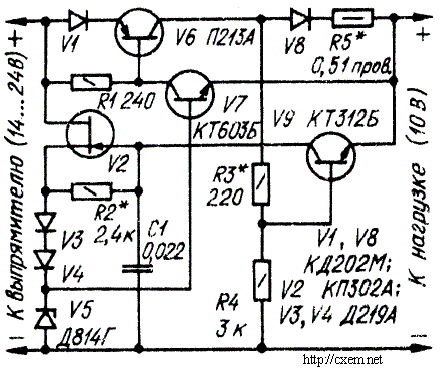 Благодаря тому, что транзистор V6 включен по схеме с общим эмиттером, коэффициент усиления в петле отрицательной обратной связи получается довольно большим, что позволяет получить хорошие выходные характеристики. Стабилизация напряжения улучшена за счет питания стабилитрона V5 от источника стабильного тока на полевом транзисторе V2. Диод V1 служит для создания небольшого (около 0,7 В) закрывающего напряжения, приложенного к базе транзистора V6 через резистор R1.