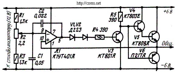 Соотношение выходных напряжений источника можно менять в пределах 0,6...1,6 переменным резистором R2. При соотношении, равном 1, максимальный ток нагрузки каждого плеча равен 2 А, при крайних-же значениях его следует снижать в 1,5...2 раза. Приставка работает подобно стабилизатору напряжения с параллельно включенным регулирующим элементом. Операционный усилитель А1 сравнивает напряжение на выходе резистивного делителя R1R2R3 с напряжением на выводе "ОБЩ." усилителя мощности V5, V6. Разница